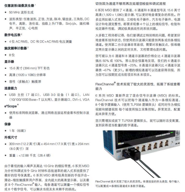 6 系列 MSO 拥有极具创新的手指开合- 滑动-缩放触摸屏用户界面,业内超大的高清显示器,以及最 多 8 个 FlexChannel® 输入,每条通道可以测量一个模拟信号 或 8 个数字信号,可以解决当前及未来棘手的挑战。